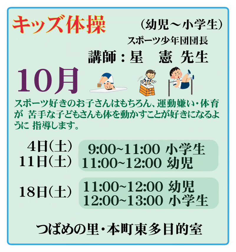 キッズ体操 2025年10月1日 最終更新日時 : 2025年10月1日 honmachi-adminplayer 開催場所へのアクセス方法はこちらでご確認ください 申込みフォーム フォトアルバム 今月のプログラム
