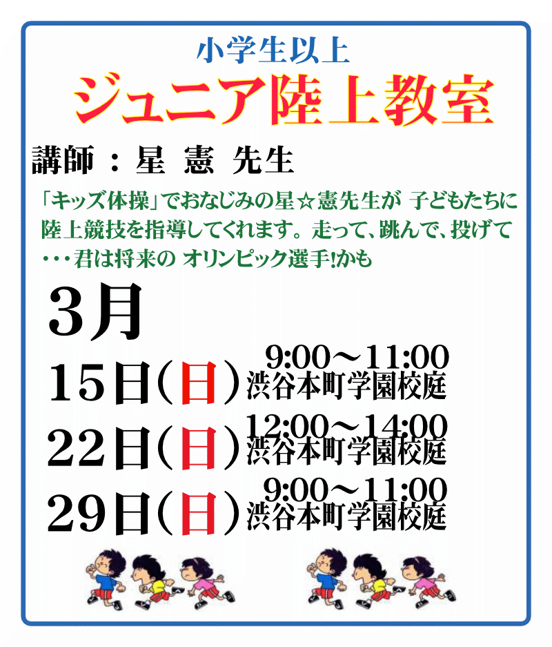 ジュニア陸上教室 2026年1月1日 最終更新日時 : 2026年1月9日 honmachi-adminplayer 開催場所へのアクセス方法はこちらでご確認ください 申込みフォーム フォトアルバム 今月のプログラム