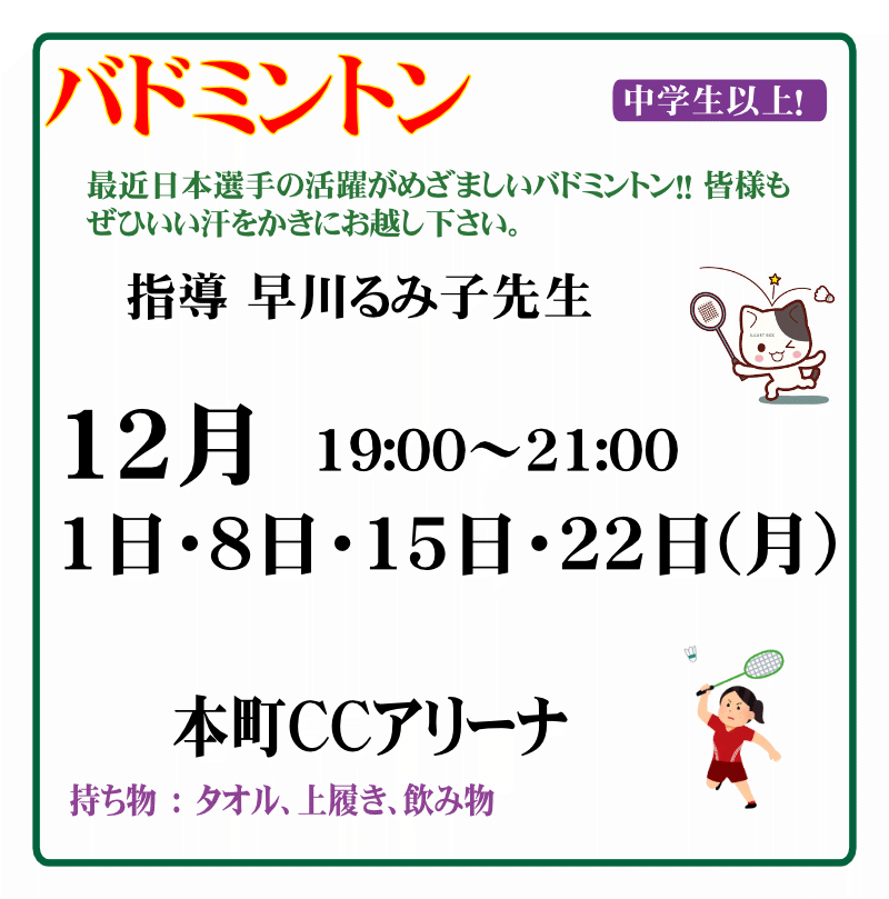 バドミントン 2025年10月1日 最終更新日時 : 2025年11月25日 honmachi-editorplayer 開催場所へのアクセス方法はこちらでご確認ください 申込書ダウンロード フォトアルバム 今月のプログラム