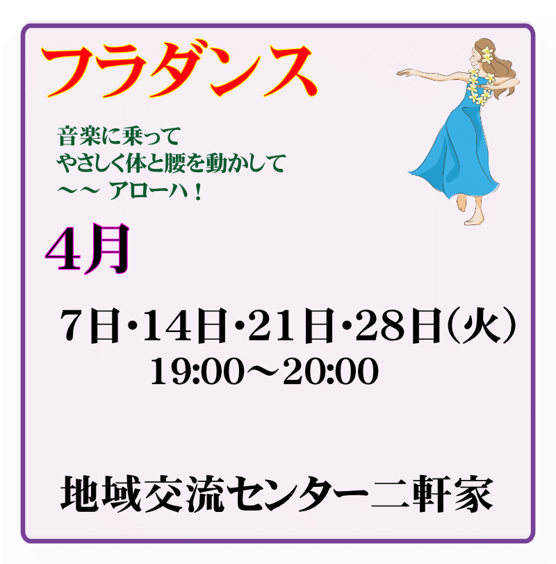 フラダンス 2026年3月1日 最終更新日時 : 2026年3月19日 honmachi-editorplayer 開催場所へのアクセス方法はこちらでご確認ください 申込書ダウンロード フォトアルバム 今月のプログラム