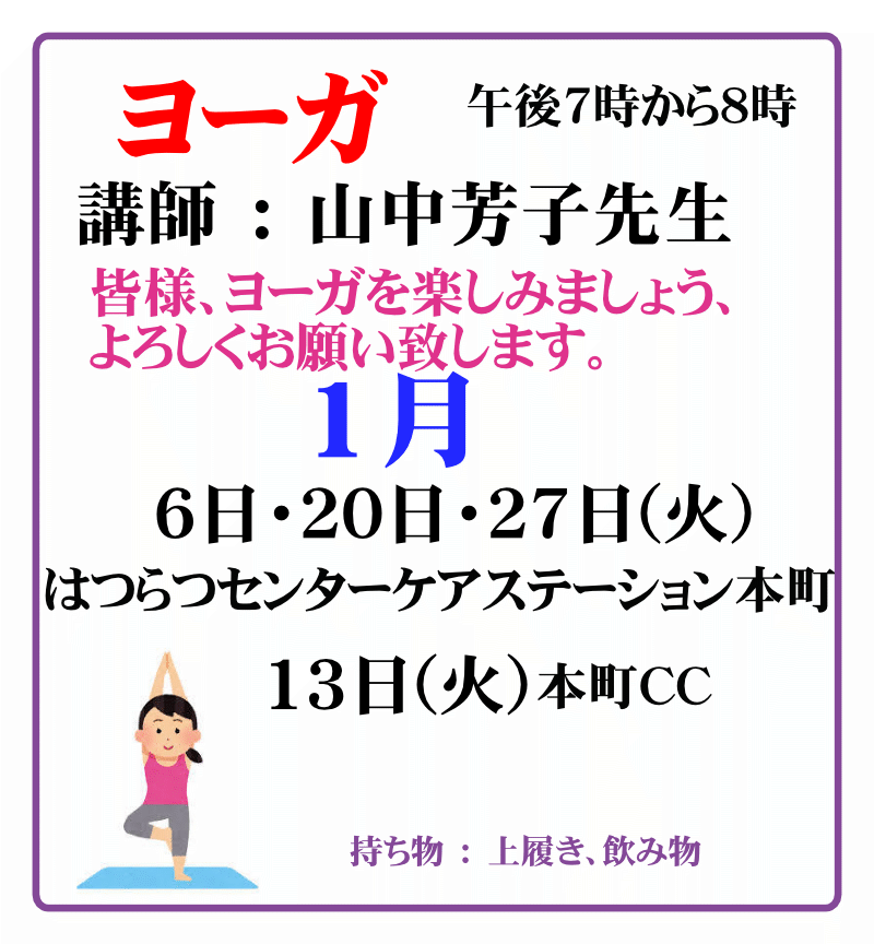 ヨーガ 2025年10月1日 最終更新日時 : 2025年12月25日 honmachi-editorplayer 開催場所へのアクセス方法はこちらでご確認ください 申込書ダウンロード フォトアルバム 今月のプログラム