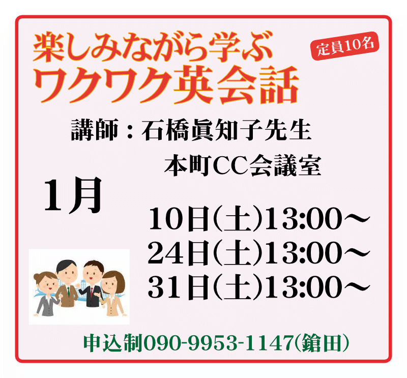 ワクワク英会話 2025年10月1日 最終更新日時 : 2025年12月25日 honmachi-editorplayer 開催場所へのアクセス方法はこちらでご確認ください 申込書をダウンロード 今月のプログラム