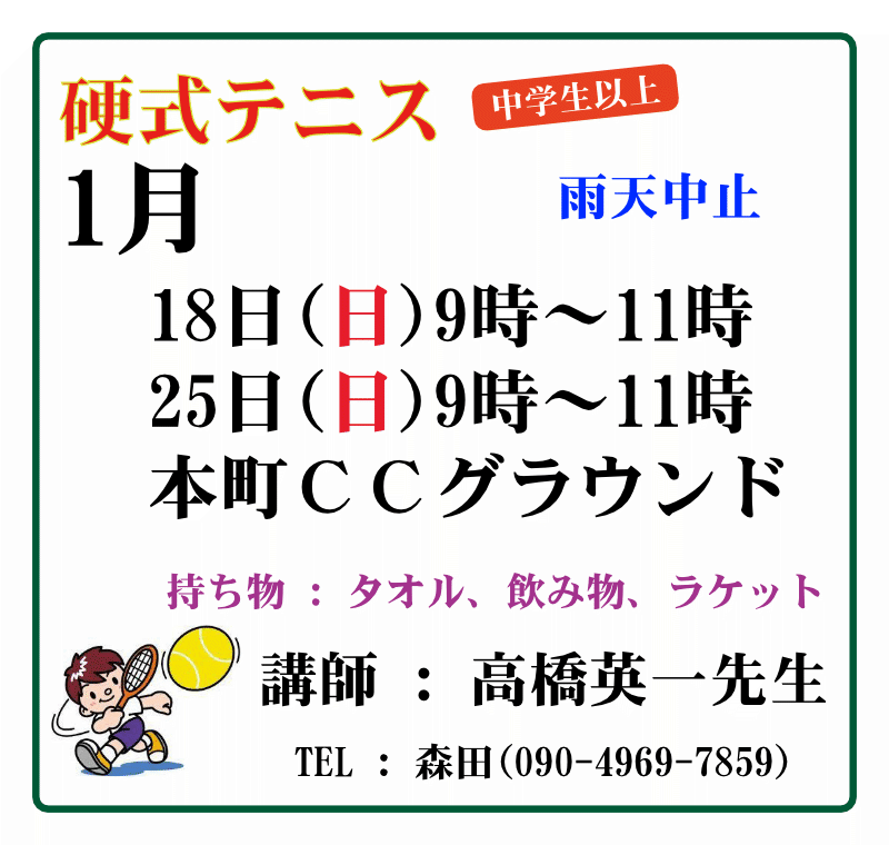硬式テニス 2025年10月1日 最終更新日時 : 2025年12月19日 honmachi-editorplayer 開催場所へのアクセス方法はこちらでご確認ください 申込書ダウンロード フォトアルバム 今月のプログラム